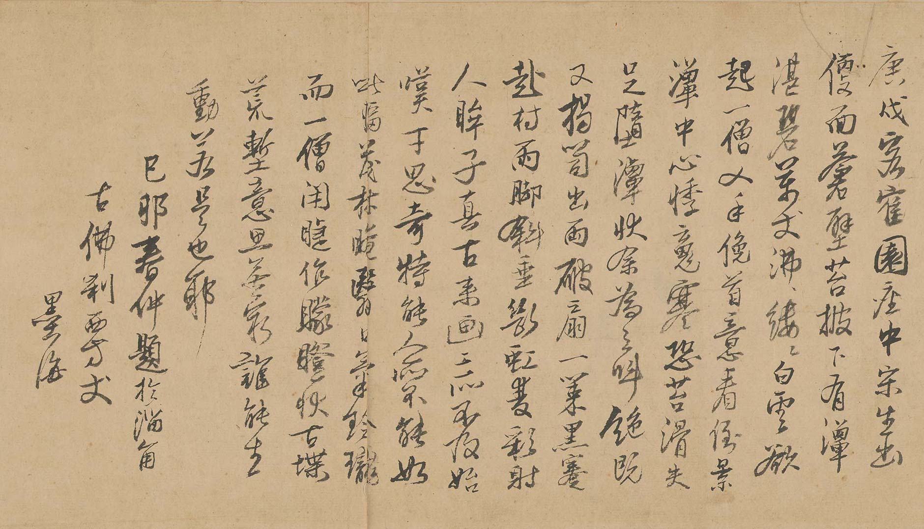 庚戌(1670)客鶴園,座中宋生出便面,蒼壁苔披,下有潭湛碧萬丈,縷縷白雲欲起,一僧叉俛首,意看倒景潭中,心悸魂寒,恐苔滑失足墮潭狀,余為之呌絕。既又揭笥,出兩破扇,一策黑蹇赴村,兩腳斜垂,斷虹發彩,射人眸子,真古來畫工亦不及,始嘆才思奇特,能人所不能。如此幅茂林晻翳,口氣玲瓏,而一僧閉睫作矇瞪狀,古堞荒塹,意思無窮,誰能生動,若是也耶?己卯(1699)春仲,題於淄角古佛剎西,方丈墨海。
